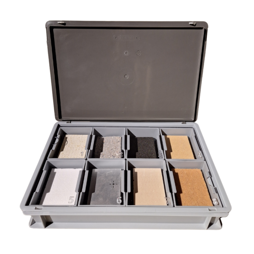 Met de isolatiekoffer kan je leerlingen kennis laten maken met diverse hedendaagse isolatiematerialen. In de koffer bevinden zich acht isolatiematerialen, de eerste zeven materialen werden aangeleverd door Soprema, het cellenglas door Foamglas.